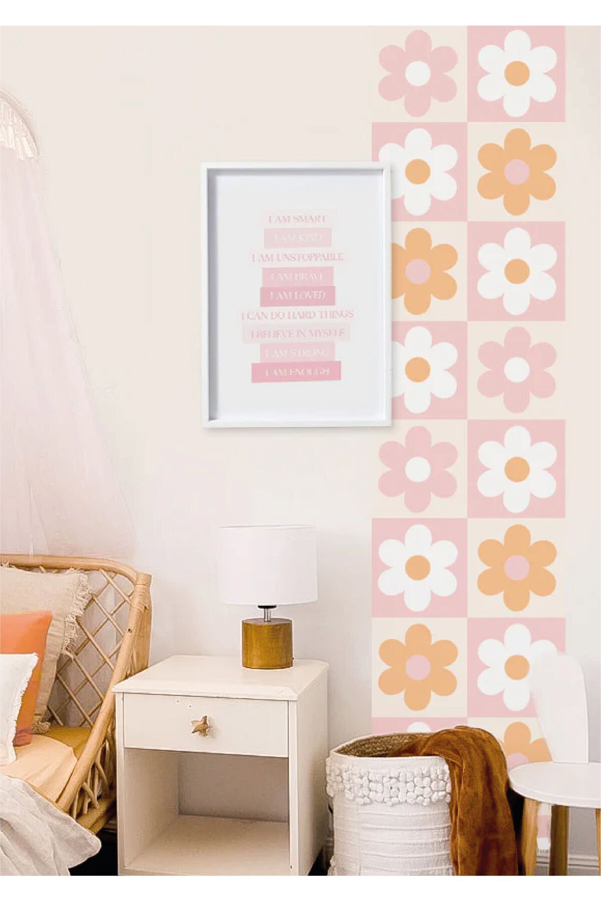 Bohem Kare - Pembe Turuncu Papatya Duvar Stickerı - 50 x 125