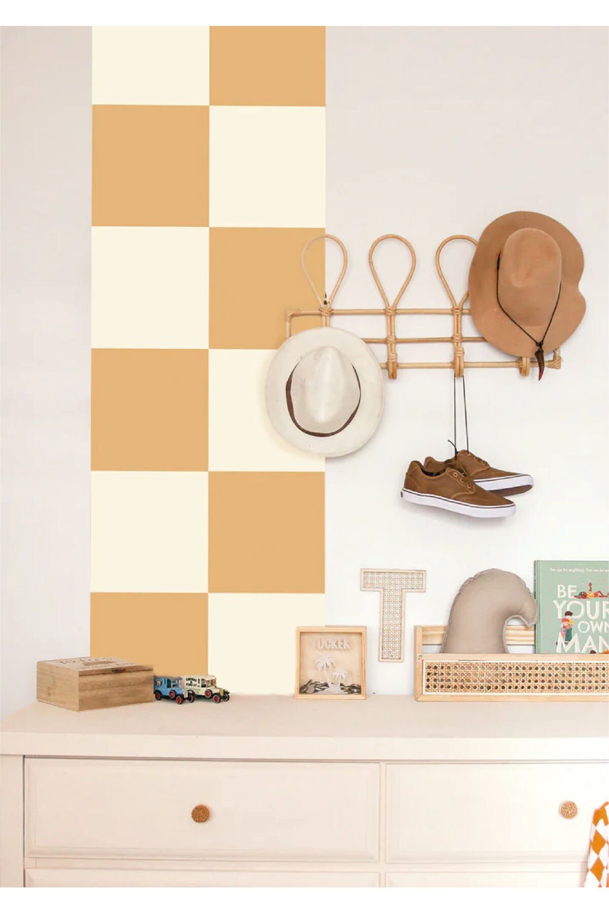 Bohem Kareler - Sarı Krem Karolar Duvar stickerı - 50 x 125