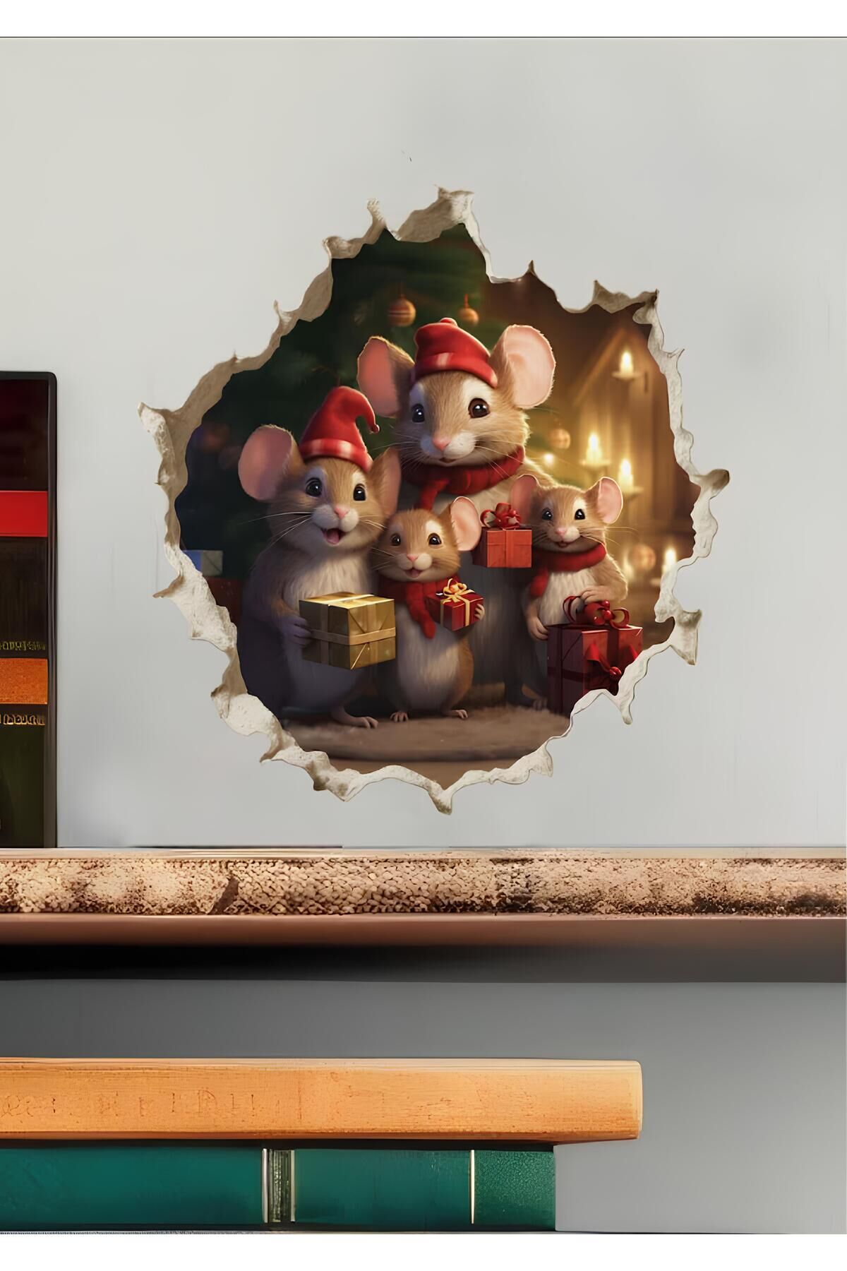 Duvar Deliğinde Sevimli Yılbaşı Fareleri Stickerı (3D Görünümlü) - 15 x 15