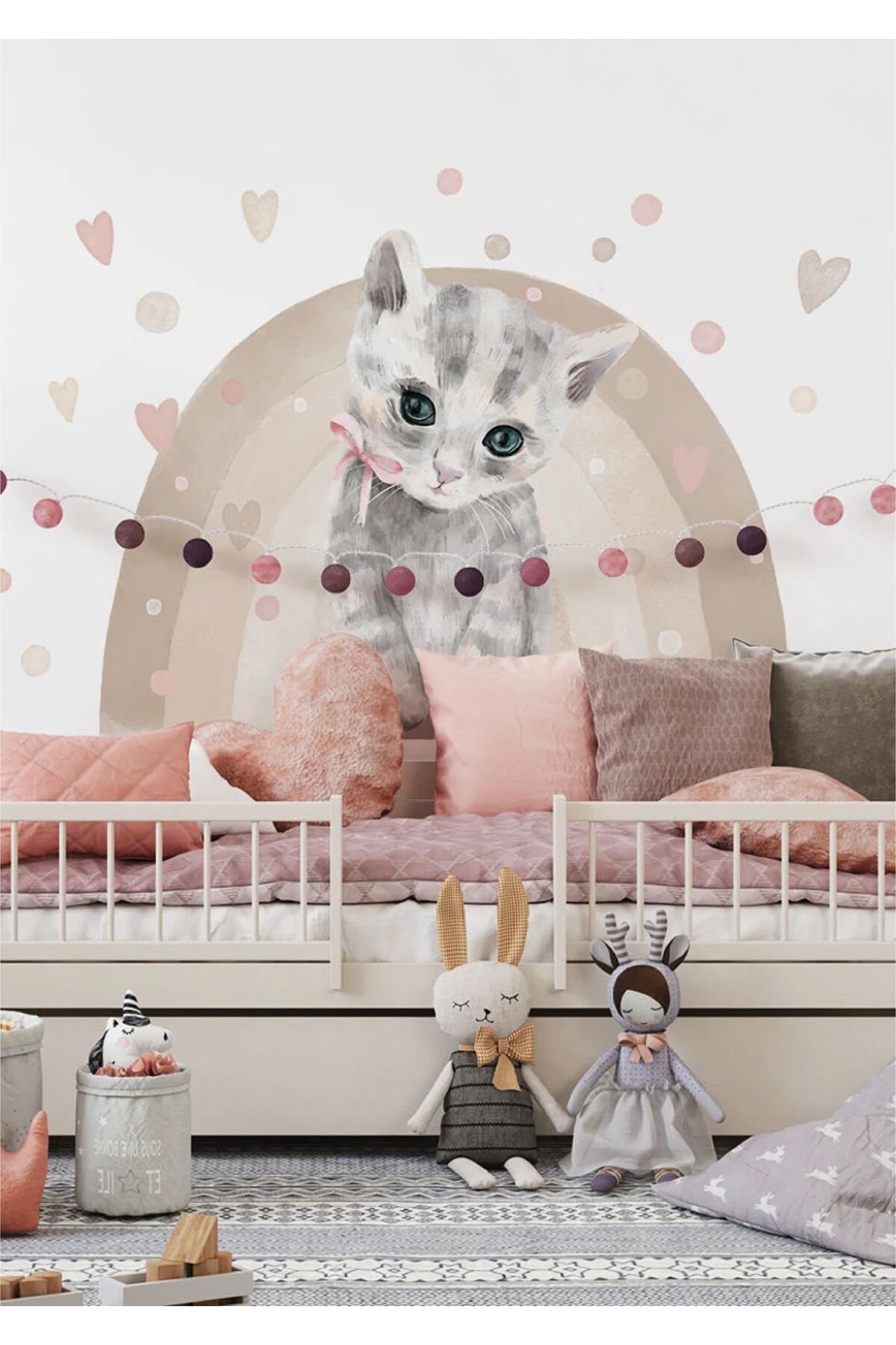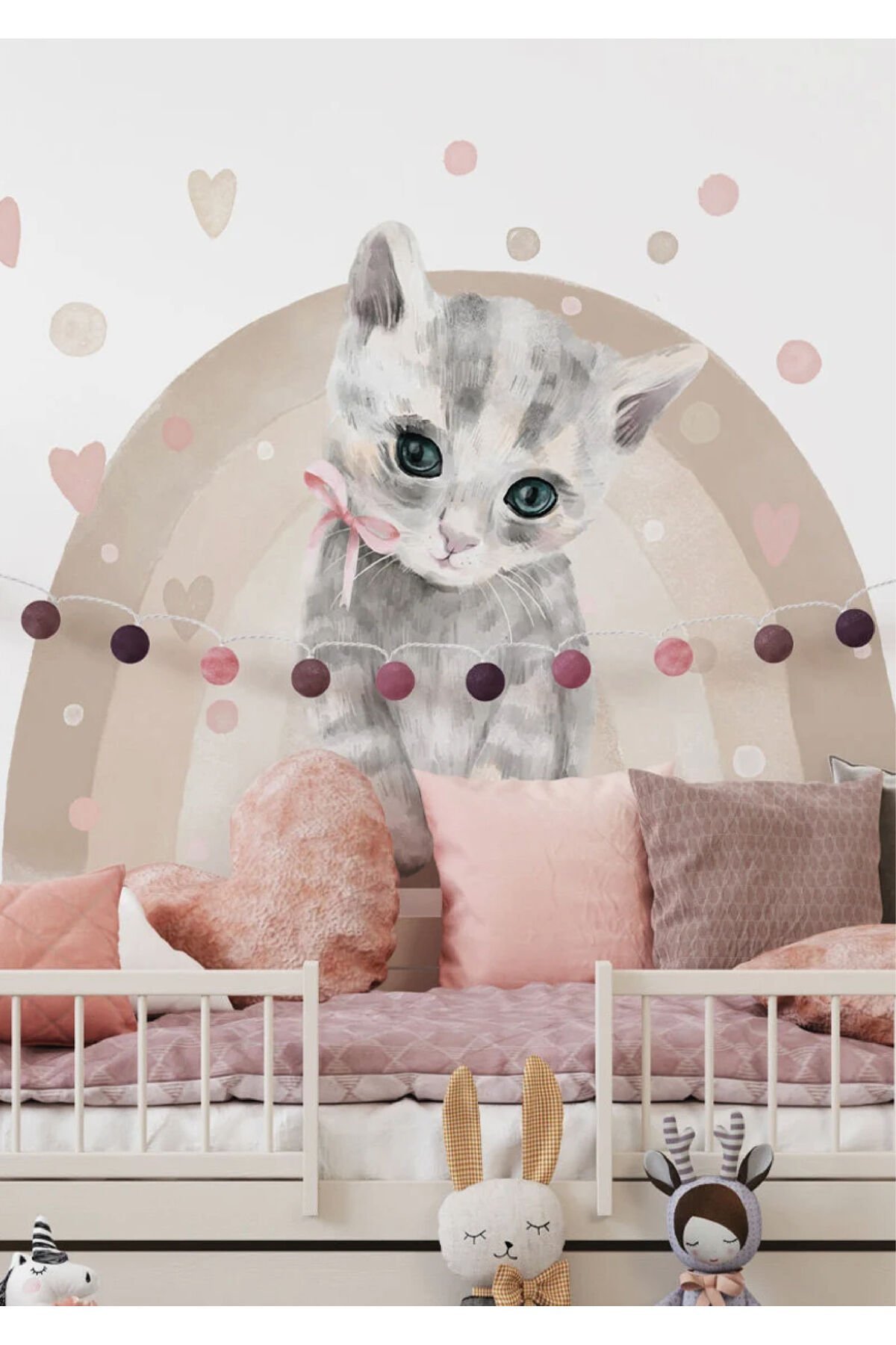Kedili Gökkuşağı Çocuk Odası Duvar Stickerı - 95 x 130
