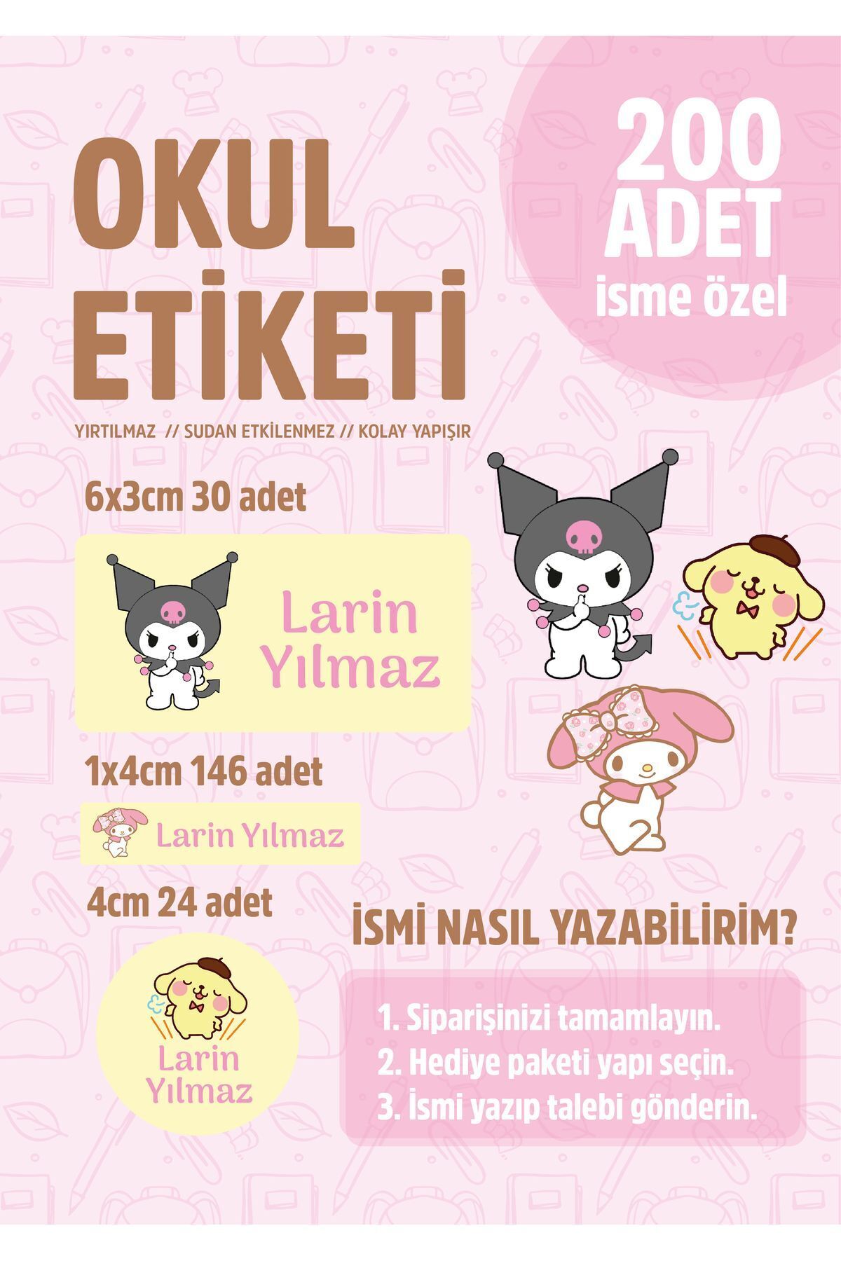 Okul Kalem Defter Etiketi Sanrio Temalı Özel Isim Yazılabilen Etiket - 200 Adet -