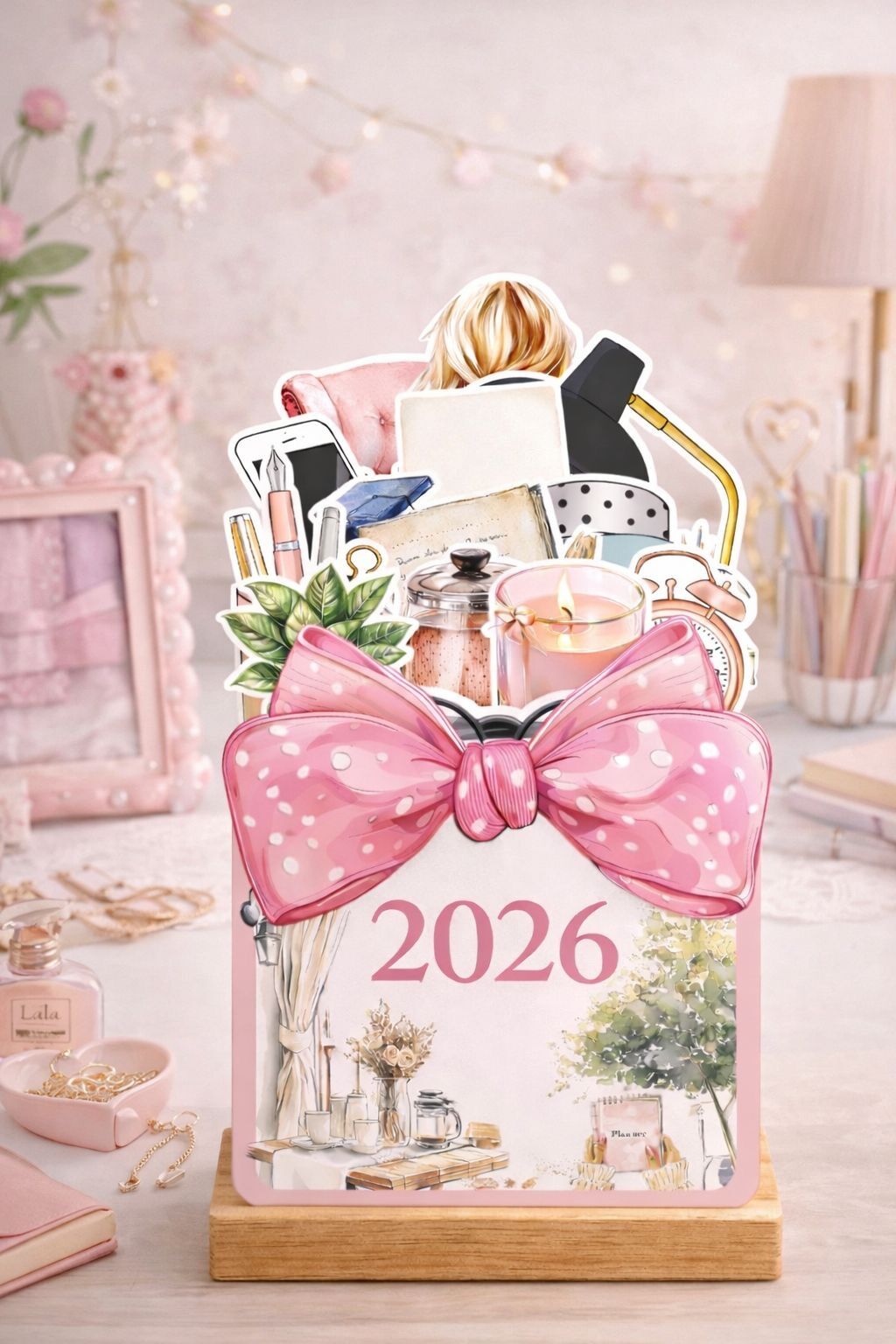 Pembe kurdele detayı, cozy masa objeleri ve yumuşak pastel tonlarıyla tasarlanan bu özel masa takvimi; hem dekoratif hem de motivasyon veren bir masa aksesuarıdır.