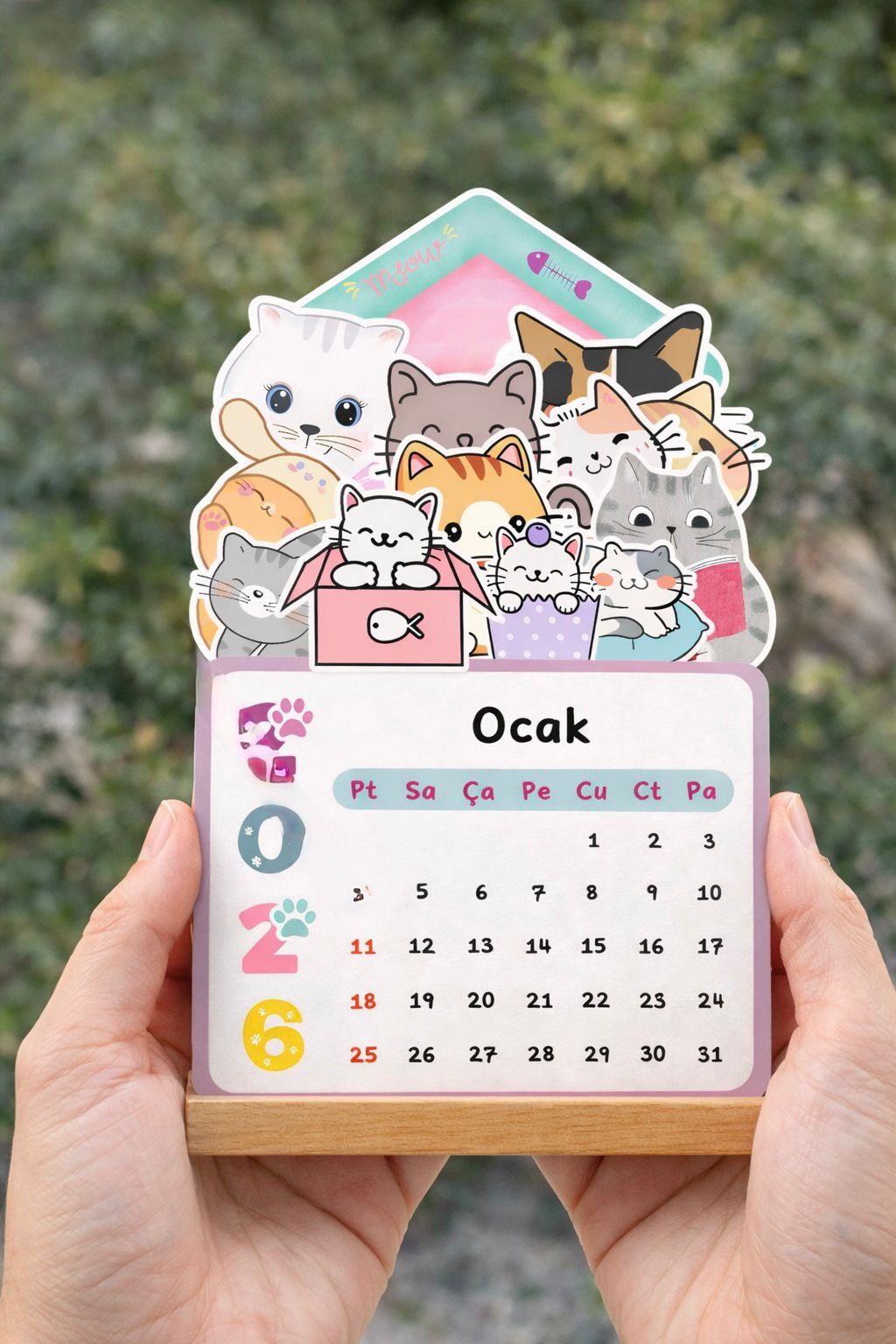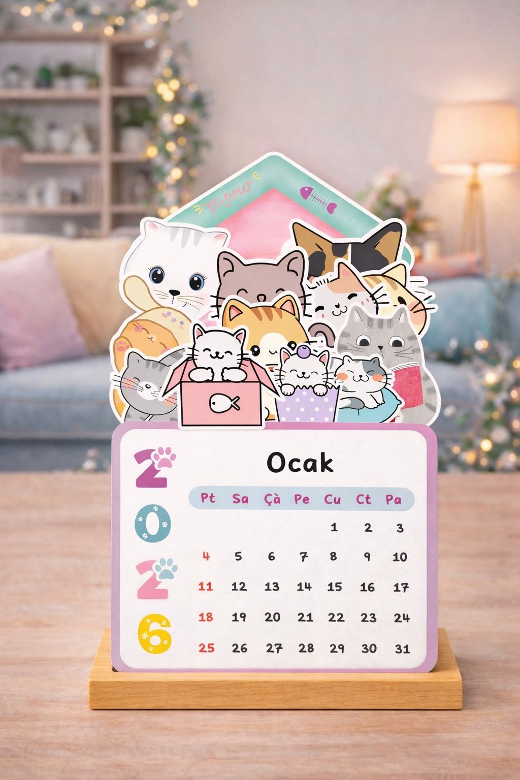 Sevimli Kediler 2026 Masa Takvimi – Ahşap Standlı Dekoratif Takvim