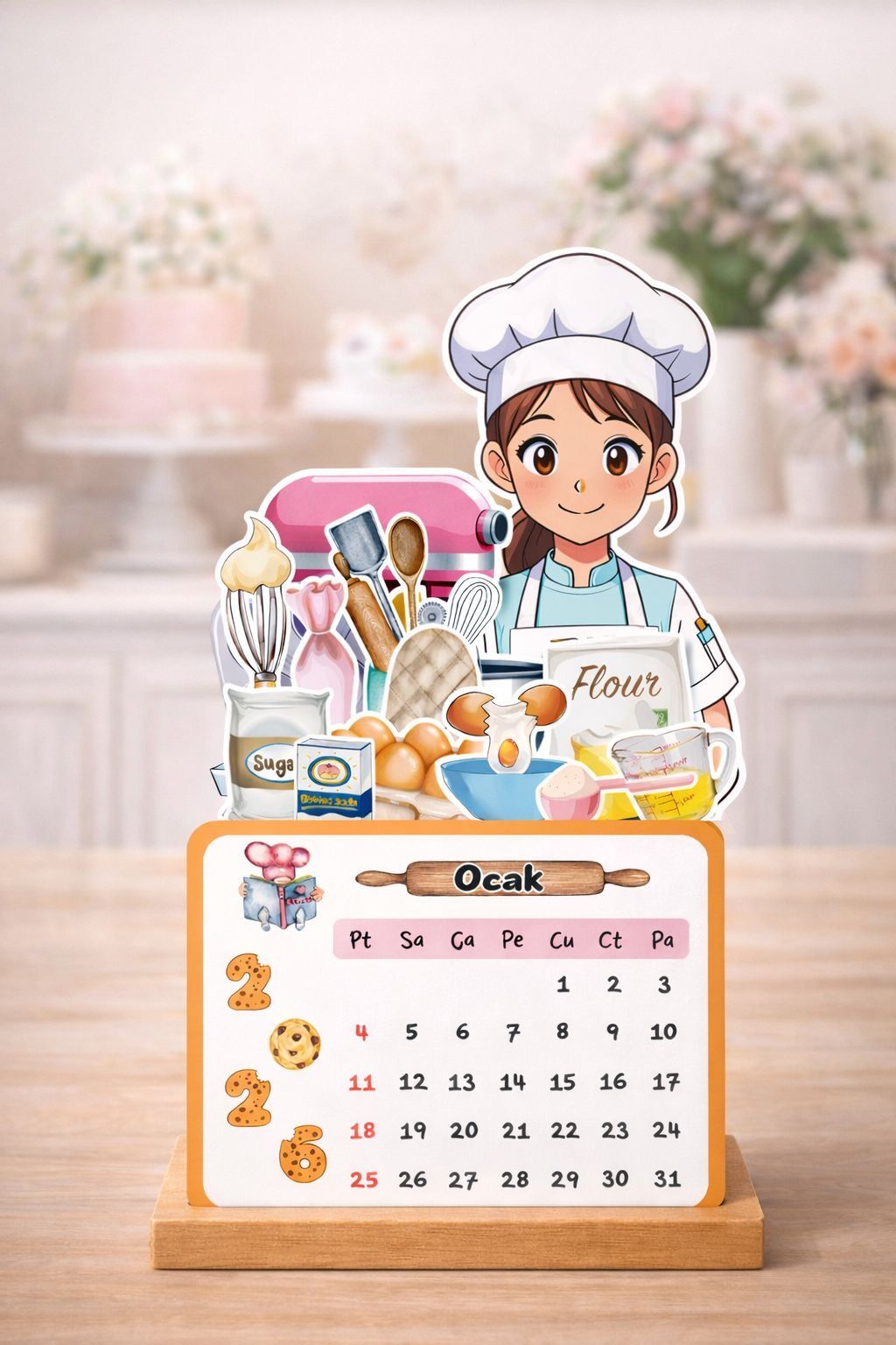 Tatlı Şef 2026 Masa Takvimi – Ahşap Standlı Mutfak Konsept Takvim